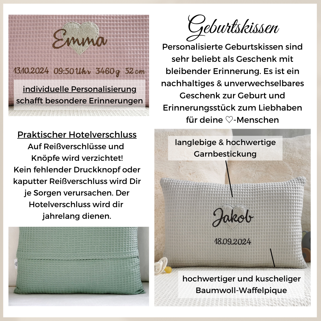 Kissen personalisiert zur Geburt - Handgemacht von Elari Handmade Design am wunderschönen Niederrhein in NRW.